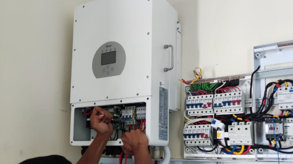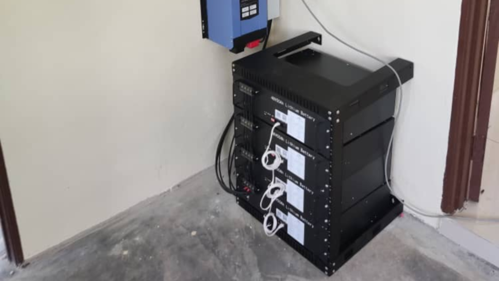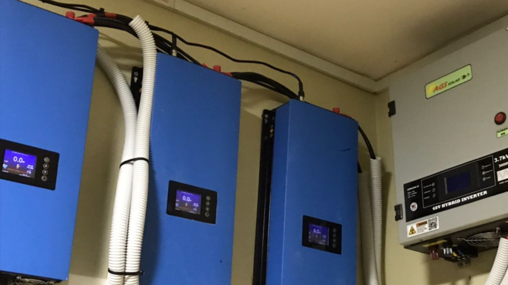 Three units of single phase grid inverter (blue color) to accommodate three phase residential supply and and one unit of off-grid inverter (grey color) for power backup.