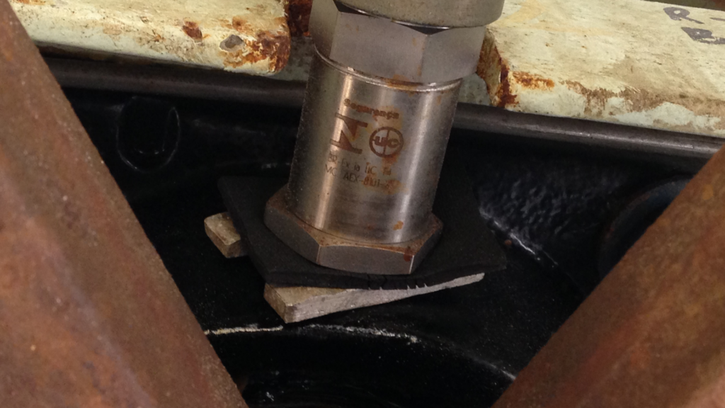 The image provided, illustrates an accelerometer sensor installed, on a curved surface of rotating equipment, with a flat metal plate and rubber pad in between them.